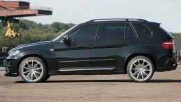 Машину оснастили набором обвесов: новыми бамперами, порогами и расширенными колесными арками. Также BMW X5 получил спортивные пружины, 22-дюймовые колесные диски Brillant Classic 2, карбоновые корпуса зеркал и наконечники выхлопной трубы из нержавеющей стали.