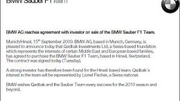 «BMW AG рад сообщить, что Qadbak Investments Ltd, фонд, чья штаб-квартира находится в Швейцарии, представляющий интересы ряда ближневосточных и европейских семей, согласился приобрести команду BMW Sauber, – говорится в пресс-релизе, распространенном BMW. – Соответствующий контракт был подписан сегодня (во вторник).